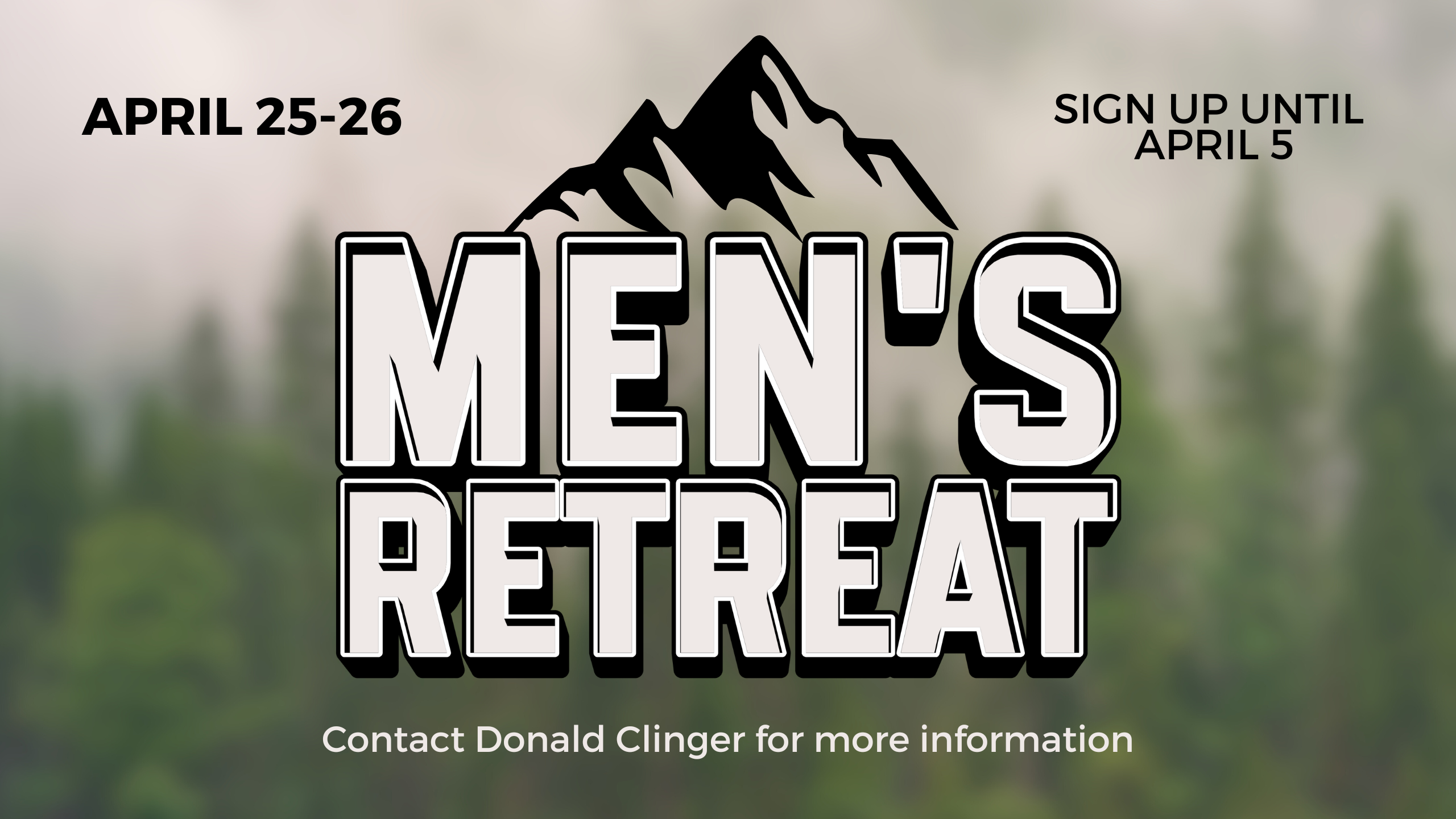 Join us for our Men’s Retreat on April 25–26, a focused time away for spiritual renewal, fellowship, and growth. This retreat is designed to encourage and equip men through teaching, prayer, and meaningful connection. Be sure to pick up a flyer for complete details, and note that April 5 is the registration deadline. For questions or more information, please contact Donald Clinger.